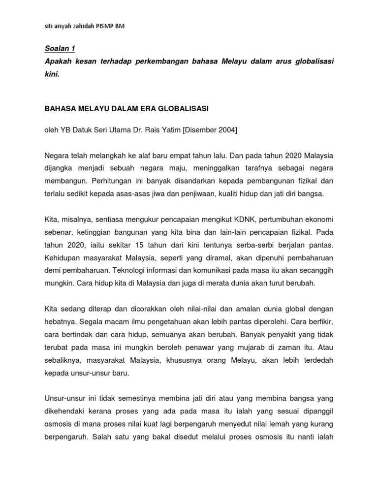 Rosululloh SAW juga bersabda pada sebuah hadist yaitu mencari ilmu itu wajib bagi setiap muslim. Sedangkan globalisasi berarti proses mengglobal proses membulat proses mendunia. Penanda Wacana Pmr Docx Penanda Wacana I Penanda Wacana Untuk Memulakan Karangan 1 2 Pada Era Globalisasi Ini Dalam Meniti Arus Kemodenan Course Hero.